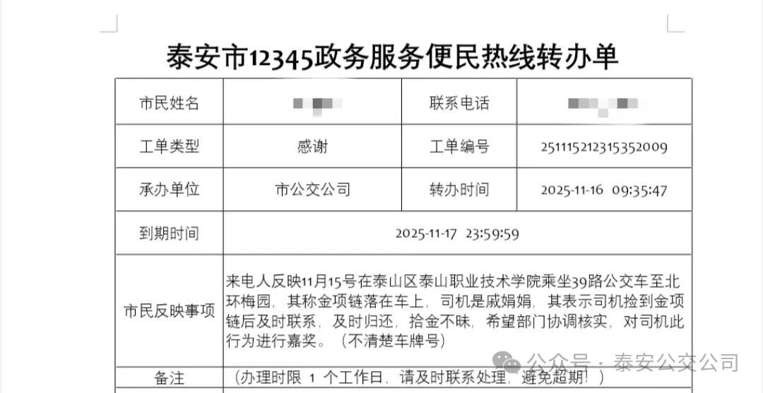 2025年11月16日,泰安市民趙女士通過(guò)泰安市12345政務(wù)服務(wù)熱線,向39路公交車駕駛員戚娟娟致以誠(chéng)摯感謝,為其拾金不昧的暖心舉動(dòng)點(diǎn)贊。