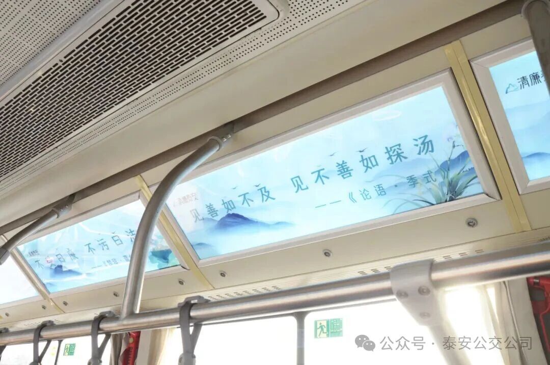 主題公交外觀融入望人松、“五岳獨尊”石刻、南天門等泰山標(biāo)志性文化元素,彰顯地域特色;車廂內(nèi)以圖文展板展示廉潔格言及泰山清廉人物事跡,配套二維碼鏈接廉潔主題動畫短片,實現(xiàn)可讀可看可傳播的多維呈現(xiàn);沿線公交站亭同步布置廉潔文化公益海報,構(gòu)建起全方位、立體化的宣傳格局。